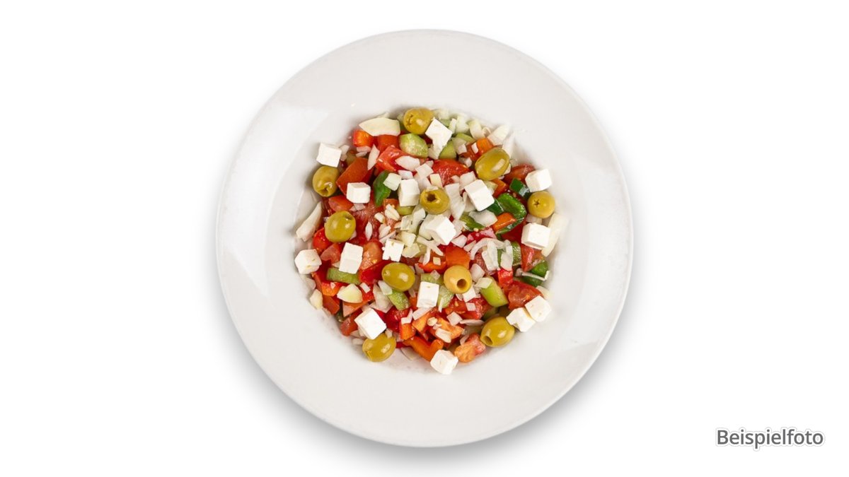mit Rucola, Petersilie, Gurken, griechischem Weichkäse, Oliven und hausgemachter Granatapfelsoße