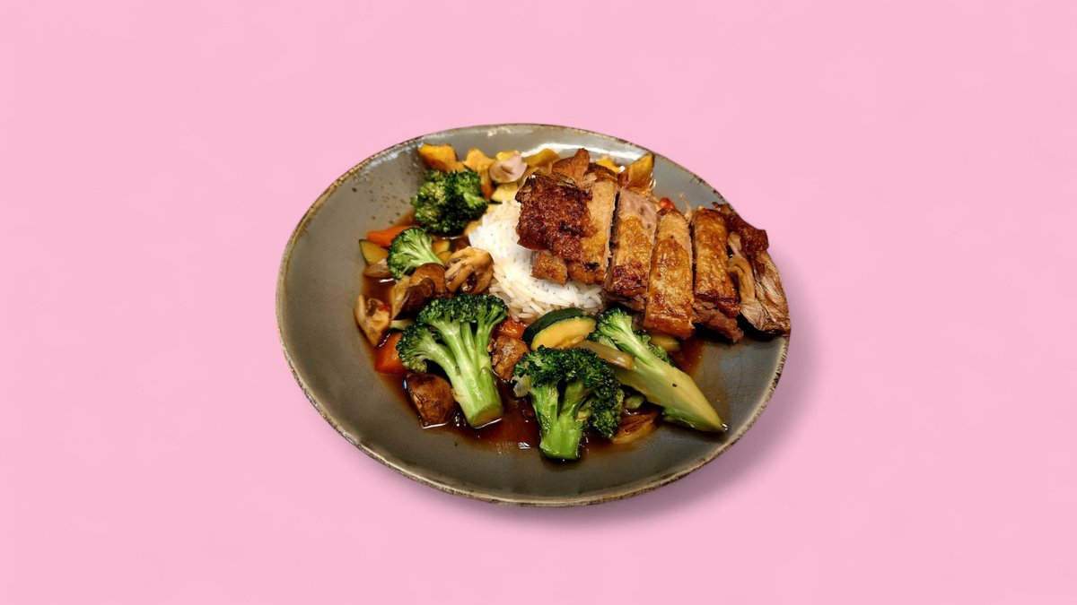 mit haugemachter Soße, Ingwer und Gemüse-Mix, serviert mit Duftreis