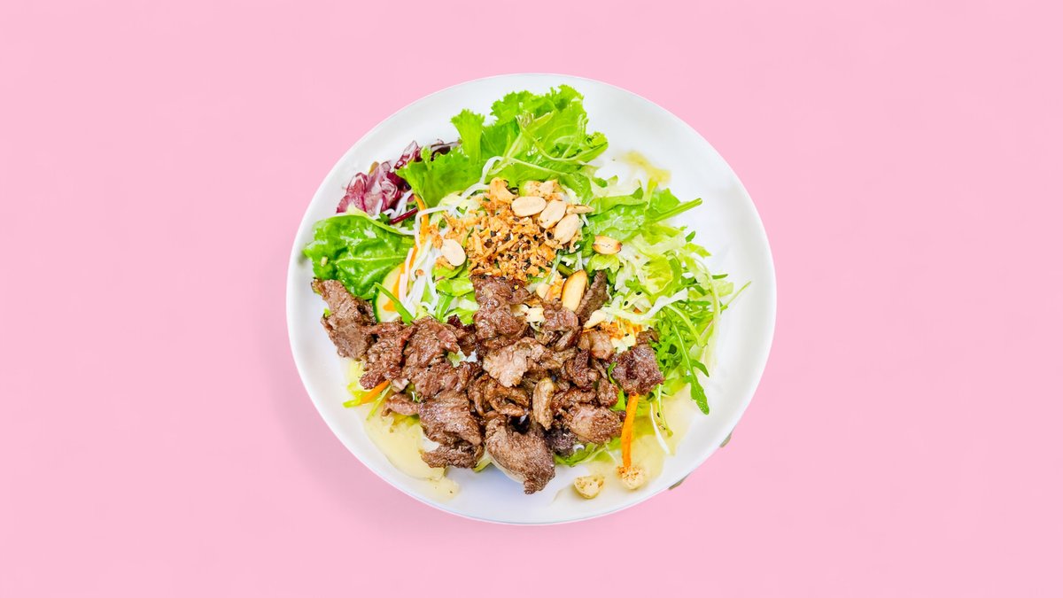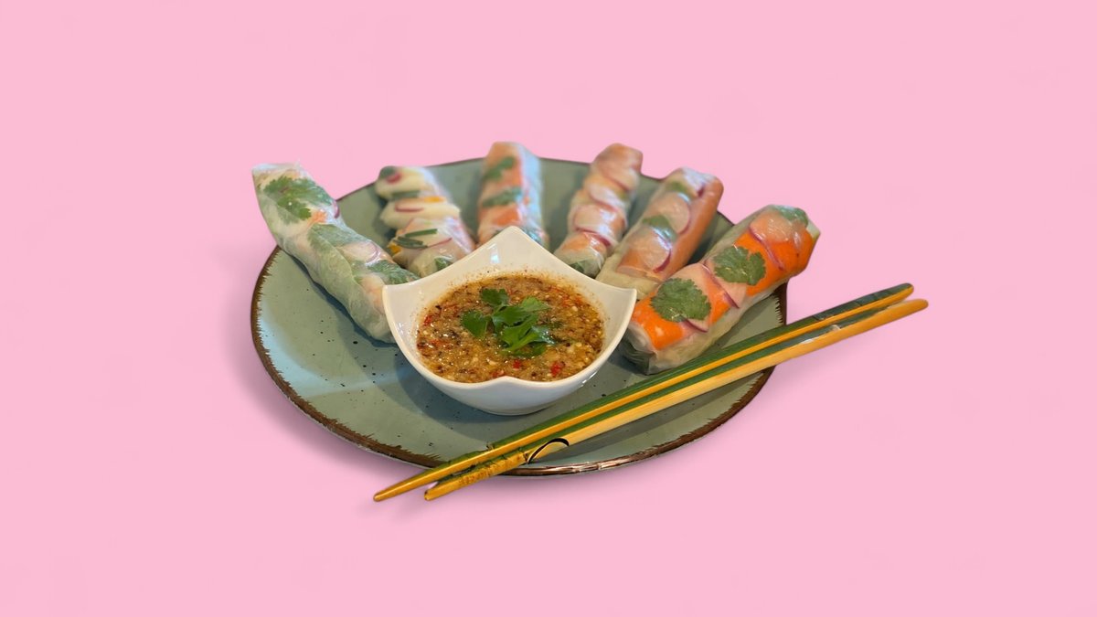 2 Stück Reisnudeln, bunter Salat, frische Kräutern und eine Zutat deiner Wahl und Limetten-Dressing