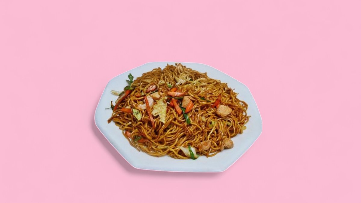 mit gebratenen Eiernudeln, Sojasprossen, Karotten und Röstzwiebeln