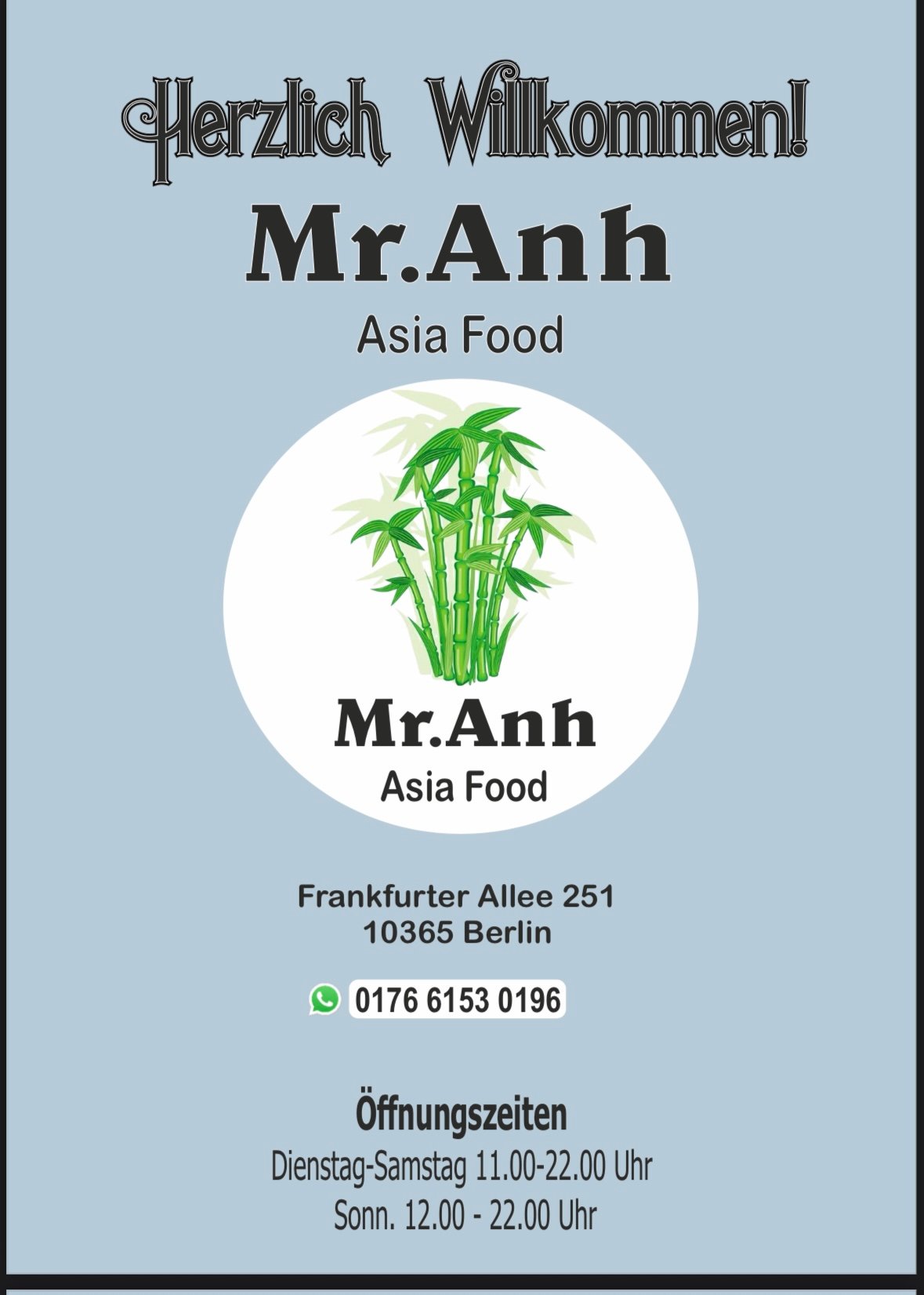 Entdecke die Welt der asiatischen Küche bei Mr. Anh! In diesem charmanten Restaurant im Herzen von Berlin erwartet dich eine kulinarische Reise durch die vielfältigen Geschmackswelten Asiens. Hier dreht sich alles um frische Zutaten, traditionelle Rezepte und eine Atmosphäre, die dich zum Verweilen einlädt. Bei Mr. Anh wird jedes Gericht mit Liebe zum Detail zubereitet. Verkäufer: Firma: Wolt Enterprises Deutschland GmbH, Anschrift: Stralauer Allee 6, 10245 Berlin, Geschäftsführer: Hadi Zaklouta, Handelsregisternummer: HRB 217122 B, Registergericht: Amtsgericht Charlottenburg, E-Mail: support@wolt.com