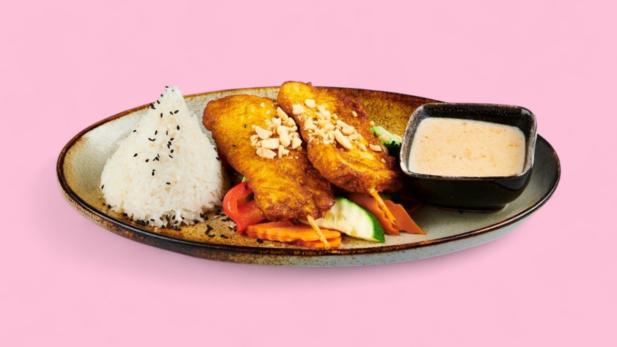 Leckere Hähnchenspieße in Erdnuss soẞe, Gemüse und serviert mit Duftreis