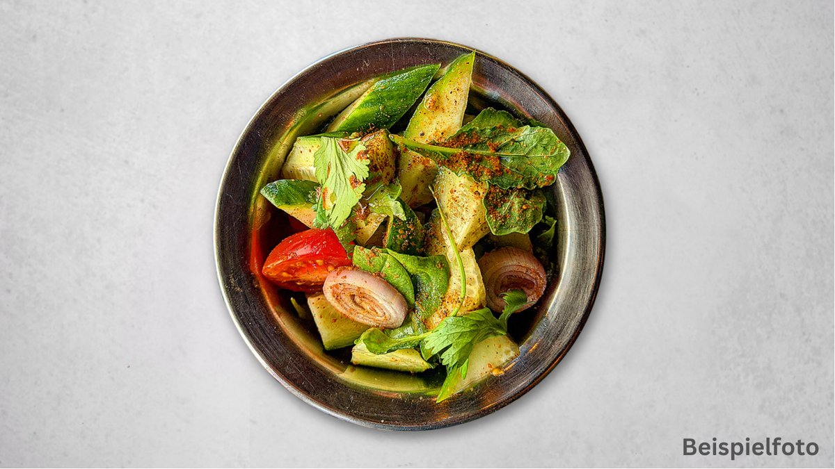 mit Gurken, Tomaten, Zwiebeln, Koriander, Olivenöl, Zitronensaft, Salatblätter und Erdnüssen
