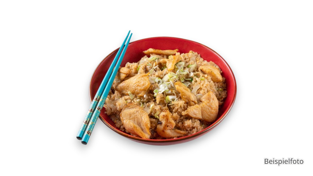 gebratener Eierreis mit Gemüse und gebackenem Hühnerfleisch
