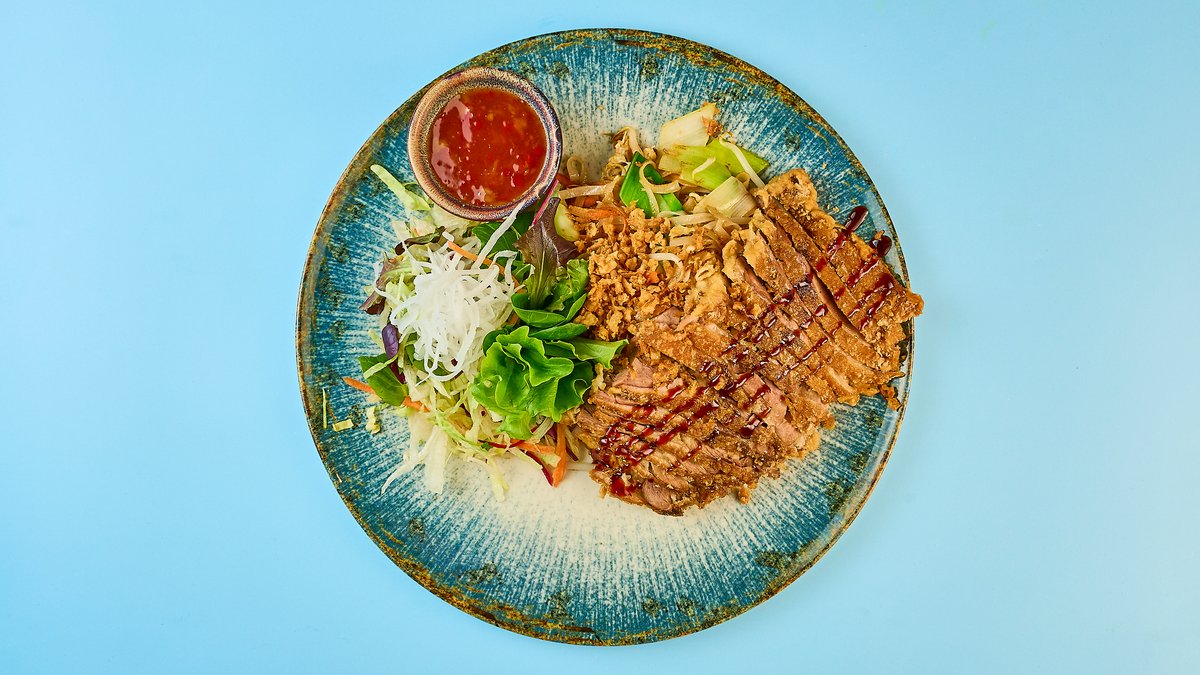 gebratene Eier-Nudeln mit Gemüse und knuspriger Ente