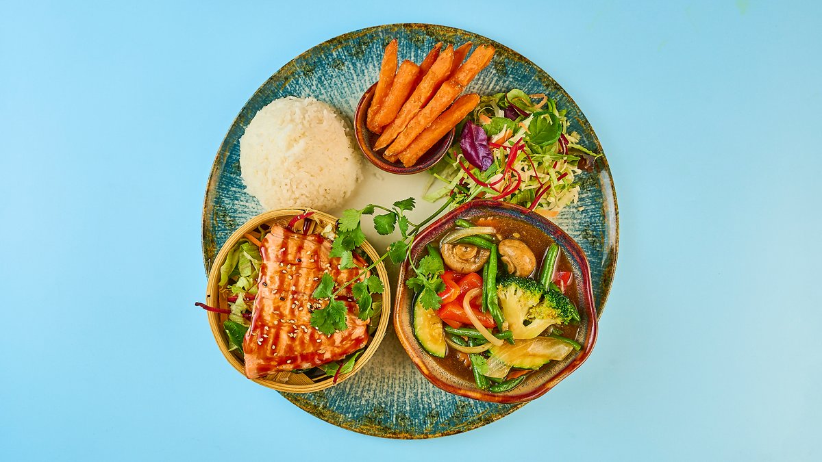alle Gerichte werden mit Gemüse und Knoblauch zubereitet und in Sojasoße auf Duftreis serviert