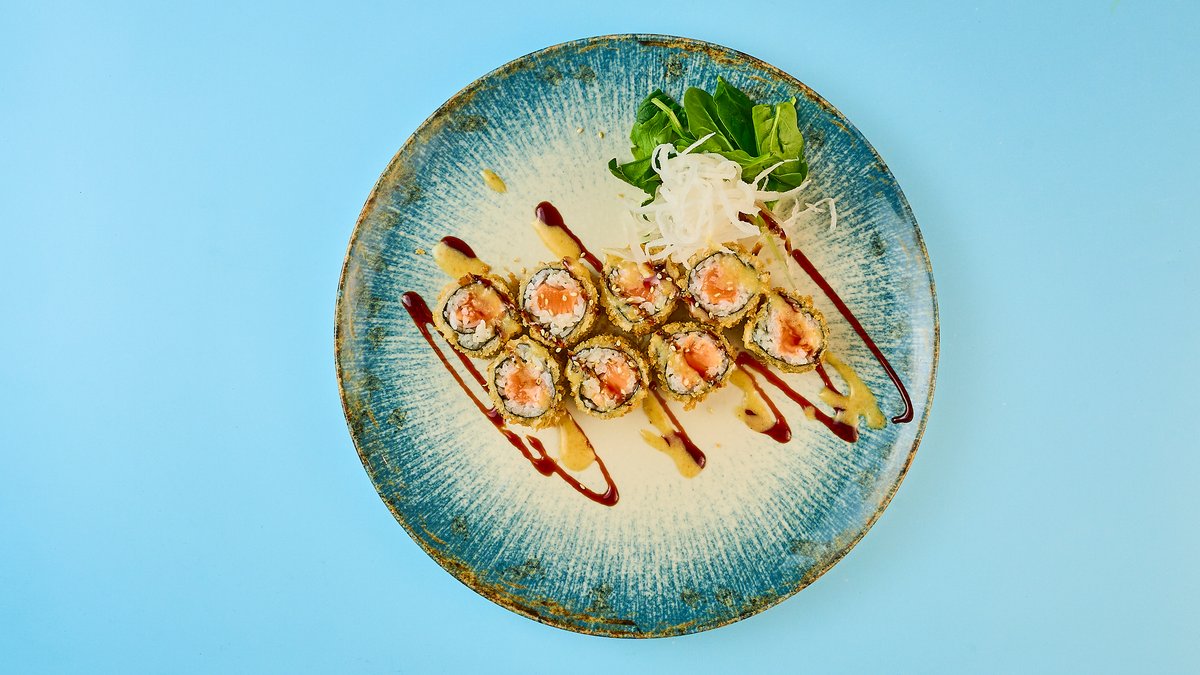 Ebi Tempura, Rucola und Frischkäse, umwickelt mit flambiertem Lachs Enthält Alkohol, für Kinder und schwangere Frauen nicht geeignet