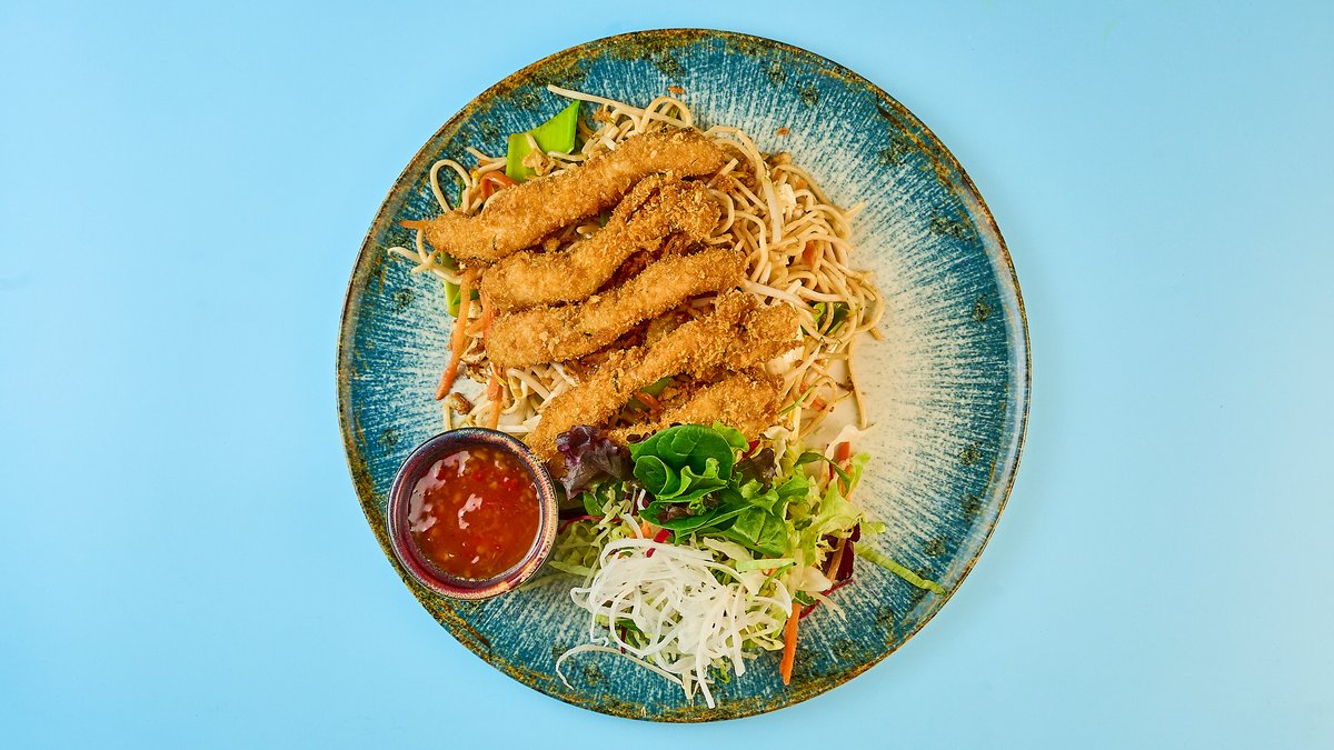 gebratene Reisbandnudeln mit Ei, gebackener Hühnerbrust und Gemüse