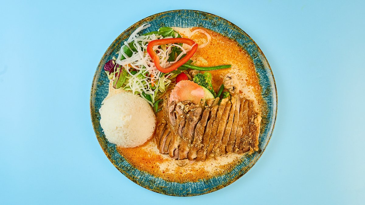 mit Kokosmilch, Gemüse und krosser Ente