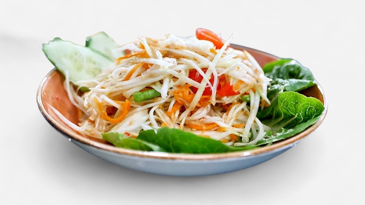 Frischer Papayasalat, knackigem Gemüse und auf Wunsch mit kleinen getrockenen Garnelen