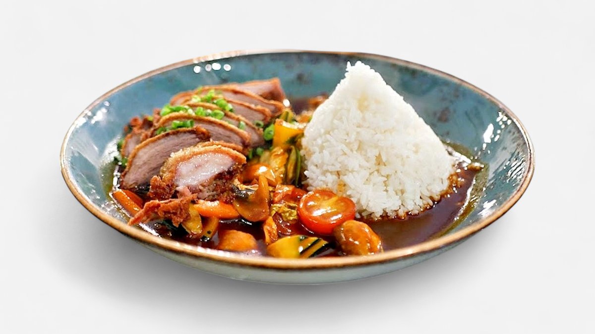 Ente kross mit knackig gebratenes, gemischtes Gemüse, Austernsoße, Knoblauch, Zwiebeln, heller Sojasoße und Reis