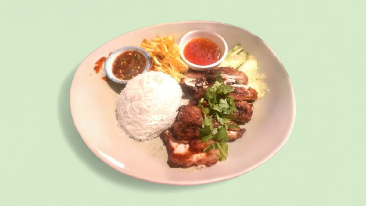 Frittiertes Hühnerbrust mit Haut, Beilagsalat, 2 Sossen und kleine Beilagensuppe mit herrlichem Jasminreis oder traditionellem Klebreis