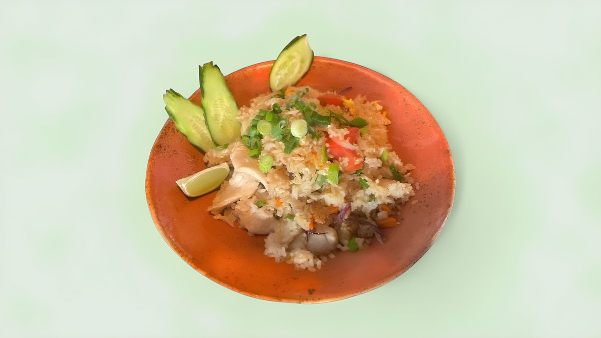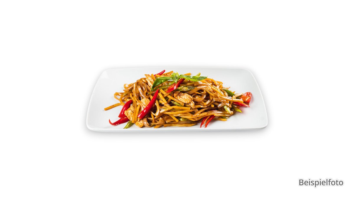 intensiv gebratenes Gericht mit Krachai, einer Zutat deiner Wahl, heller Sojasoße, Austernsoße, süßer Sojasoße (Ketchap Manis), grünen Bohnen, Aubergine, Peperoni und Reis