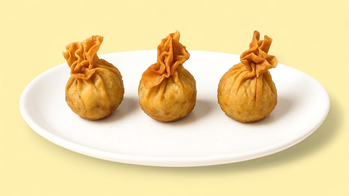 2 Stück Teigtaschen gefüllt mir Kartoffeln, Erbsen und Nüssen, garniert mit Soße