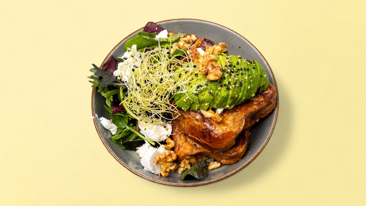 mit Frischkäse, Avocado, Spiegelei garniert und Salatbouquet