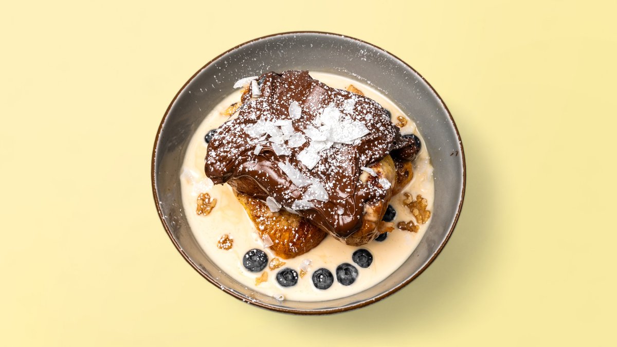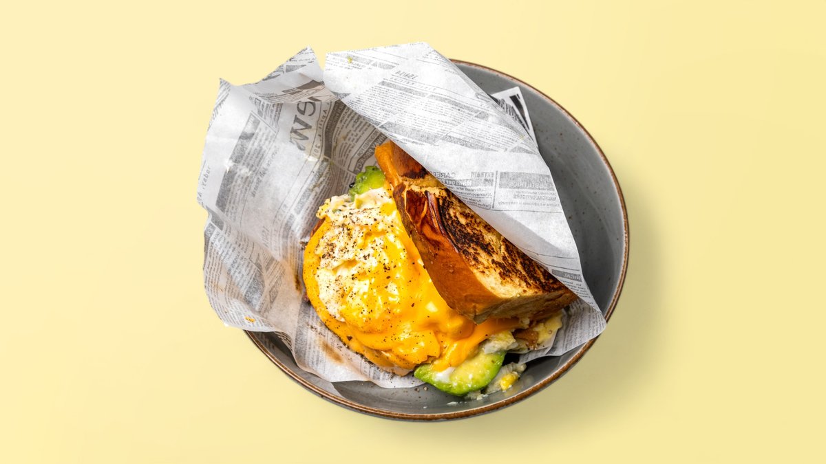 Brioche mit französischem Rührei, Avocado, Frischkäse und Gouda Flambiert