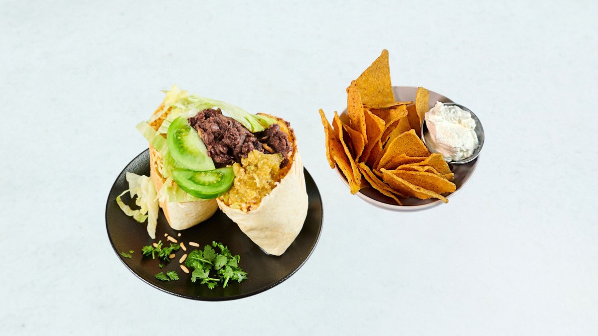 Herzhafter Burrito gefüllt mit schwarzen Bohnen, Tofu und geschmolzenem Käse. Dazu Nachos mit Sour Cream