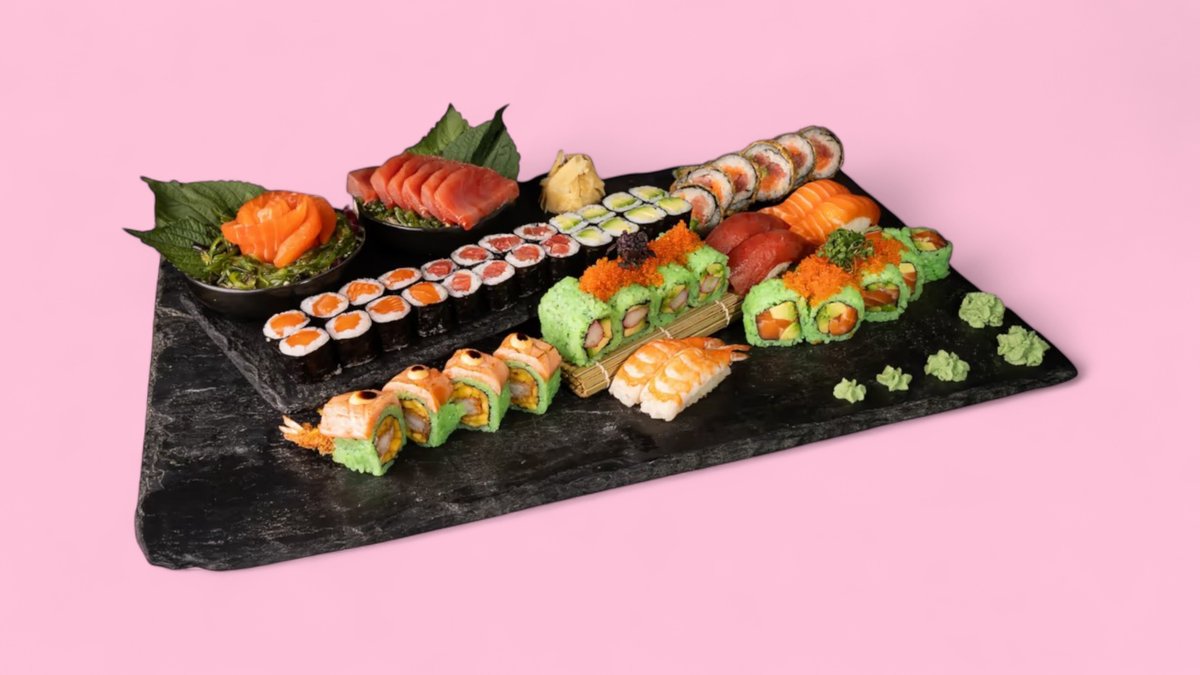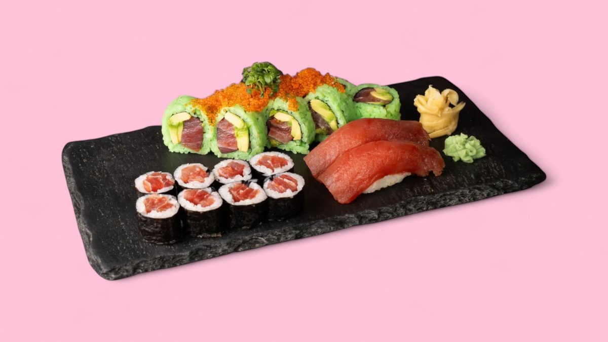 2 Sake Nigiri, 2 Ebi Nigiri, 2 Maguro Nigiri, 8 Sake Maki, 8 Tekka Maki, 8 Avocado Maki, 8 California I.O, 8 Alaska I.O, 4 Tiger Roll, 6 Mix Tempura, 6 Sake Sashimi, 6 Tekka Sashimi