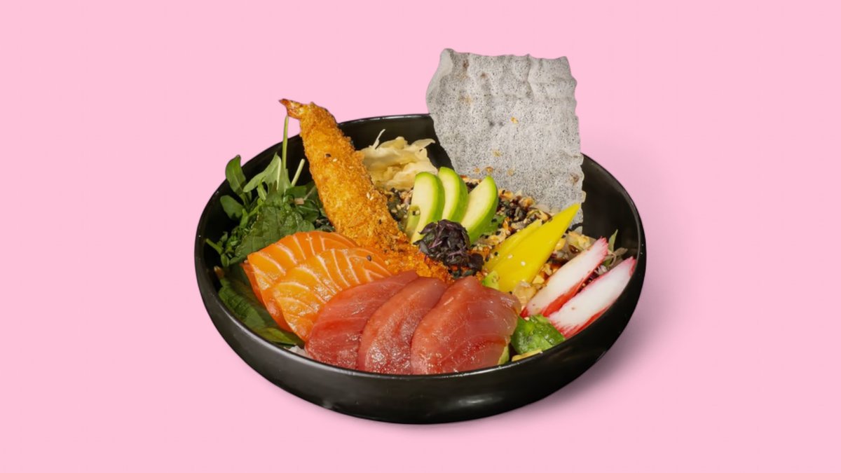 Sashimi (roher Fisch) mit NOUMìs Haussauce, frischem Salat, Krebsfleischimitat, Seetangsalat & Sesam, serviert mit Jasminreis