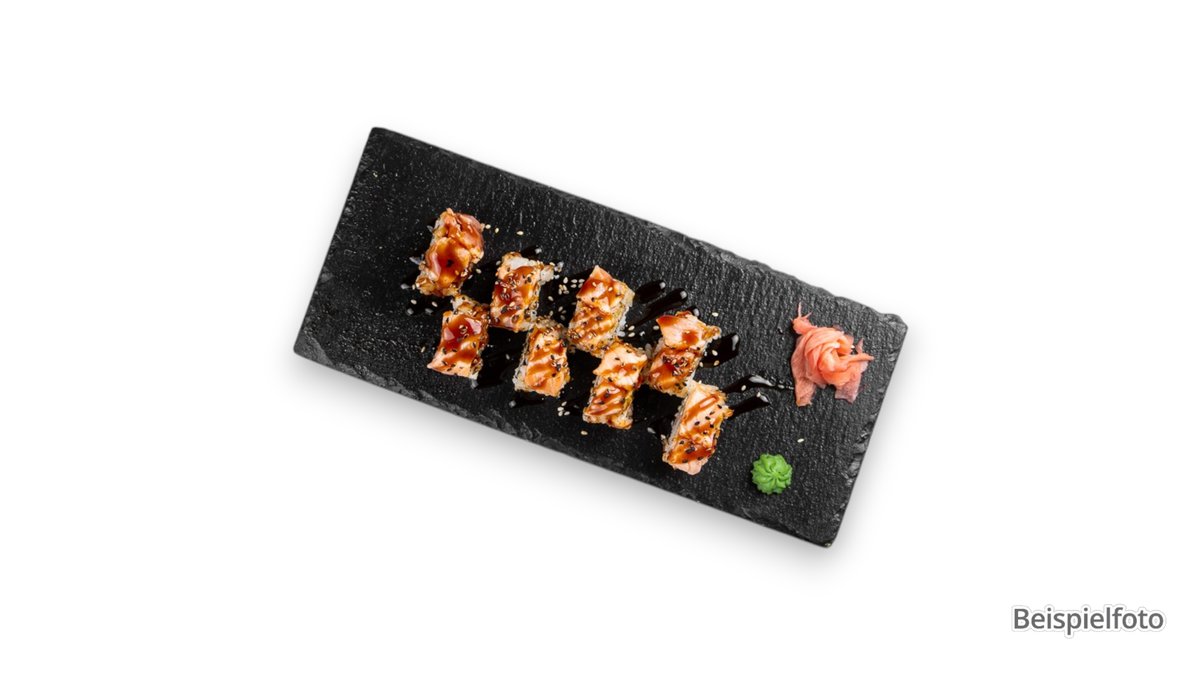 mit knusprigen Garnelen, Mango, Avocado, ummantelt mit flambiertem Lachs und Ikura