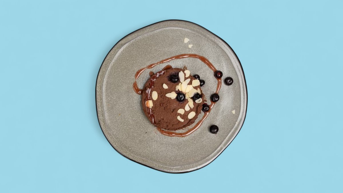 süßer Hummus aus Kakao, Datteln, Mandelmilch und Kichererbsen. Serviert mit frischen Früchten. (Wir verwenden je nach Verfügbarkeit die Früchte, die wir gerade da haben)