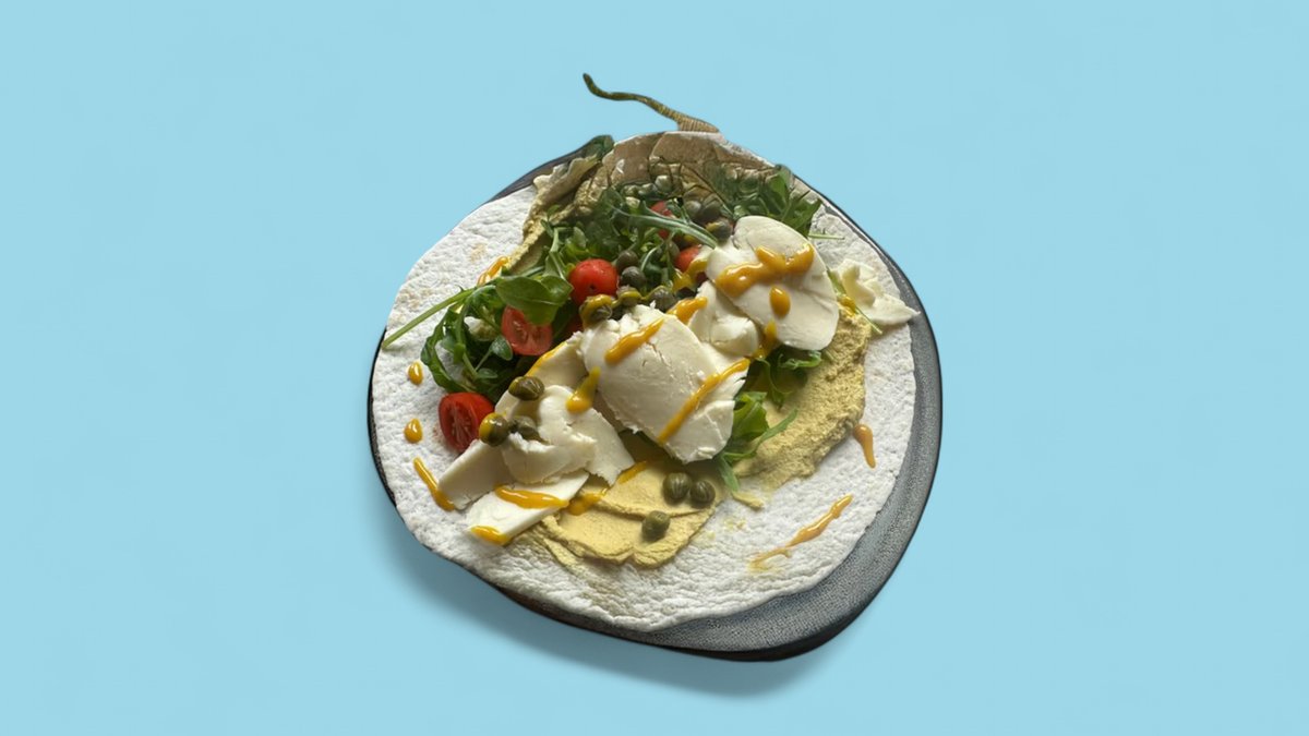 Tortilla Wraps, Hummus, Mozzarella, Kichererbsen, Rucola, Tomate, Kapern, Senfsoße und Salz.