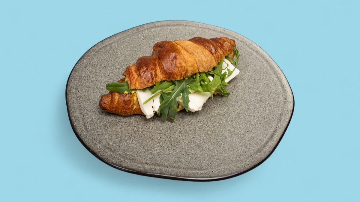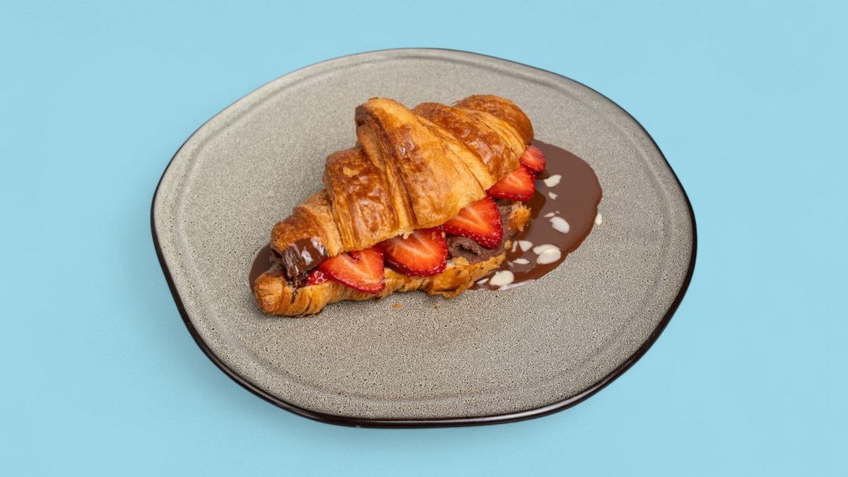 Ein Croissant serviert mit Schoko-Hummus und frischen Früchten. (Wir verwenden je nach Verfügbarkeit die Früchte, die wir gerade da haben)