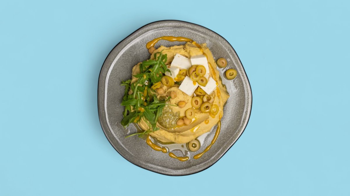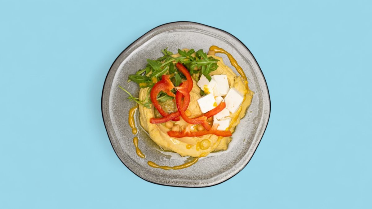 Hummus, Pesto, Rucola, Kichererbsen, Senfsoße, Oliven und Feta.