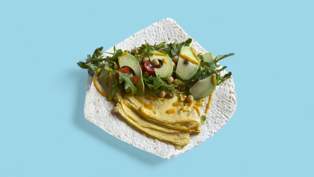Tortilla Wraps, Hummus, Avocado, Kichererbsen, Rucola, Tomate, Kapern, Senfsoße und Salz.