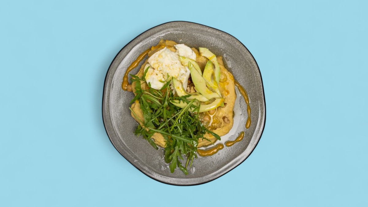 Tortilla-Brot mit roten Bohnen, Mais, Feta, Mozzarella und Crème fraîche Mit geriebenem Käse und Tomatensoße überbacken. Dazu werden Avocadoscheiben und Rucola serviert.