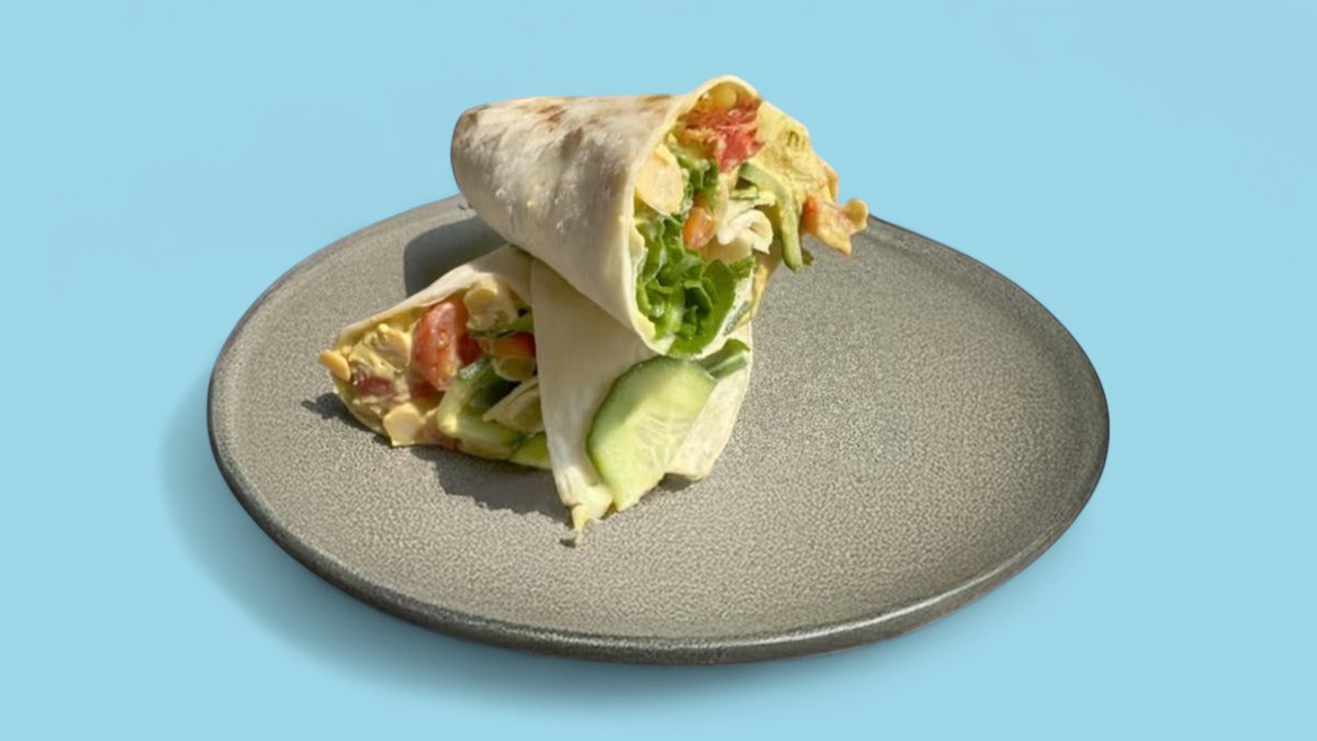 Tortilla, Kichererbsen, Hummus mit Senfsoße, Tomate, Gurke, Kapern, Paprika, Rucola.
