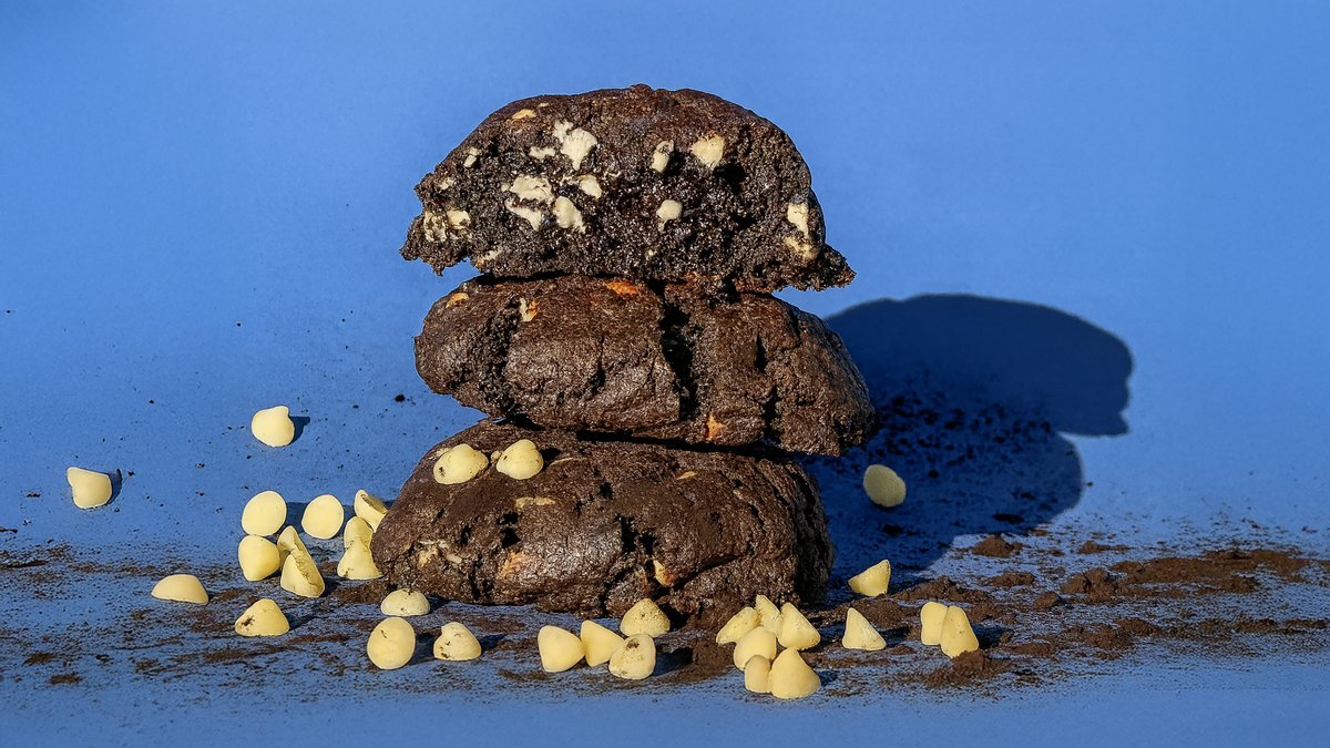 Handmade chocolate cookie dough with two different cacao flavors and filled with French white chocolate.