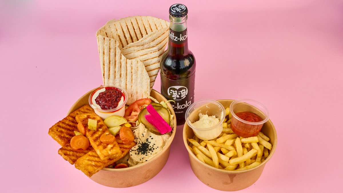knuspriges Hähnchenfilet und gegillter Halloumi, kombiniert im warmen Fladenbrot mit Salat und Dip nach Wahl