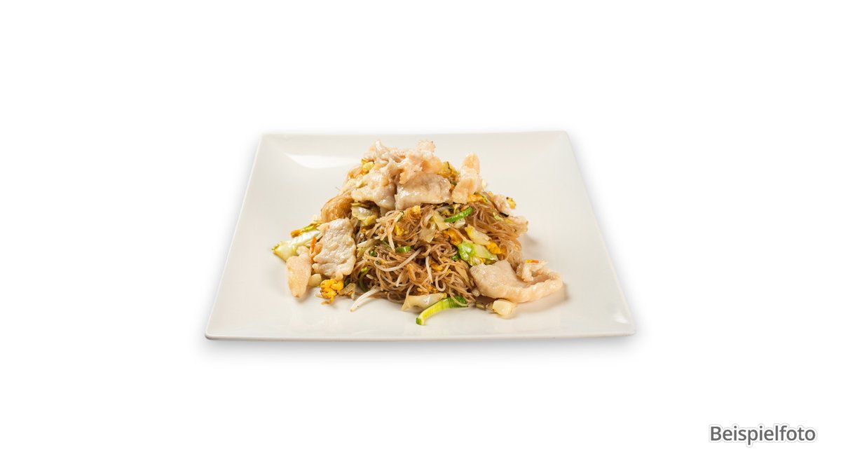 gebratene Reisbandnudeln mit Ei, Sojaprossen, Möhren, Erdnuss-Röstzwiebeln Topping und einer Zutat deiner Wahl
