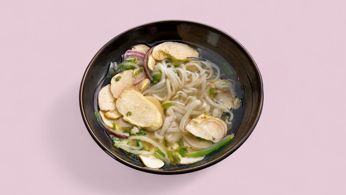 traditionelle vietnamesische Reisbandnudelnsuppe in kräftiger Brühe mit Ingwer, Lauchzwiebeln, frischem Kräutern und einer Zutat deiner Wahl