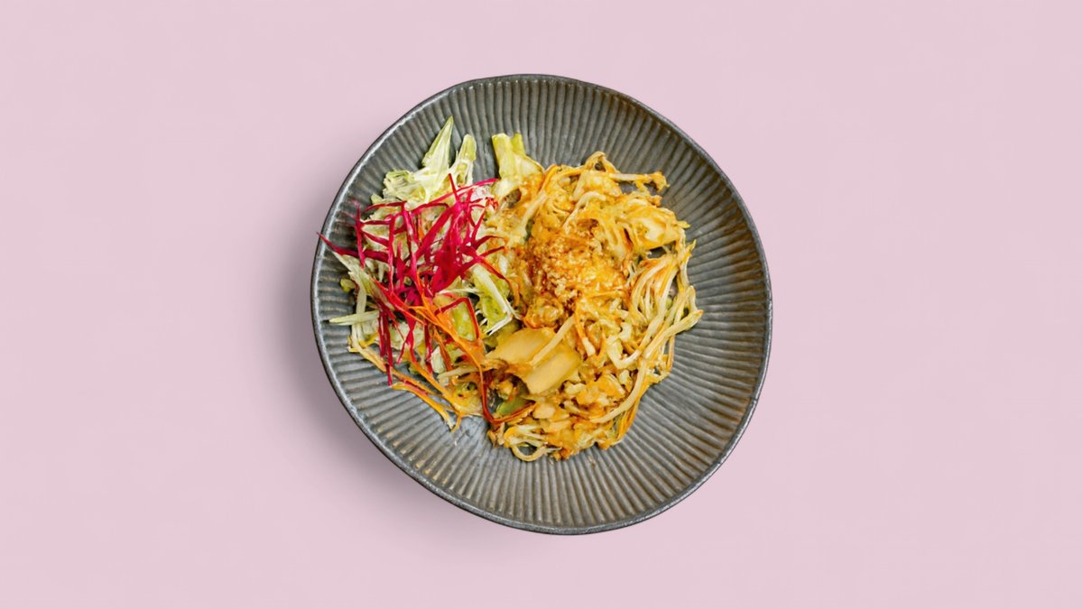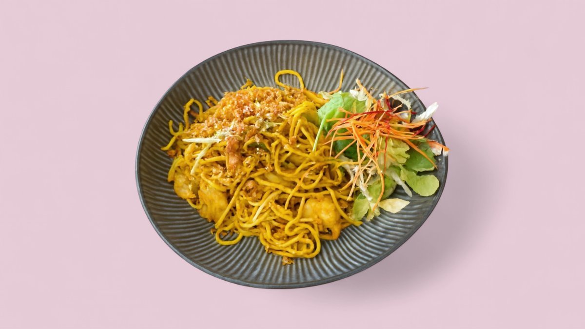 gebratene Eiernudeln mit frischem Gemüse, Kräutern, Röstzwiebeln Topping und einer Zutat deiner Wahl