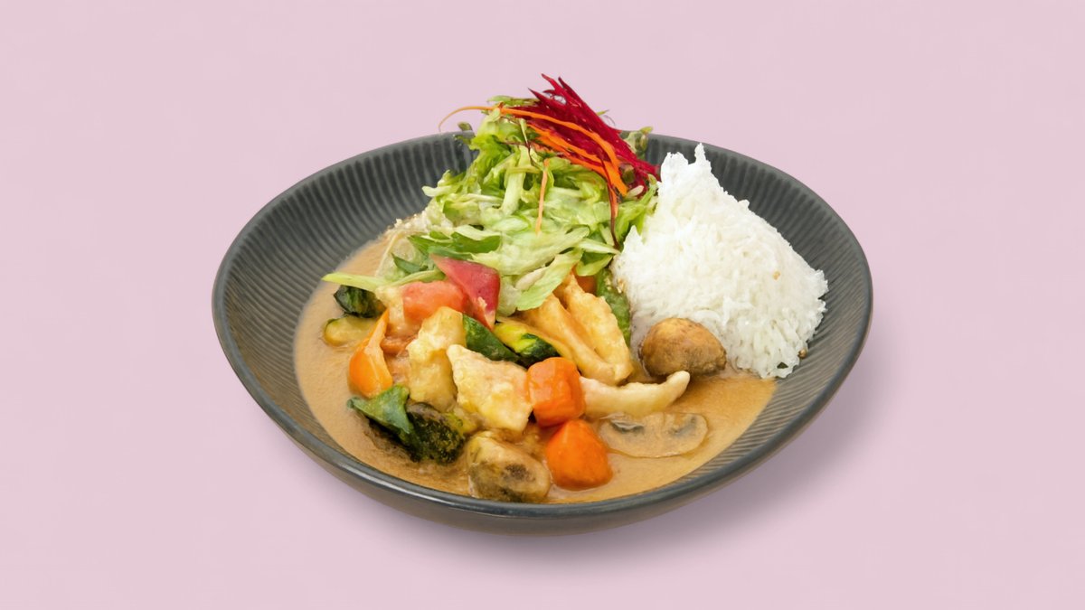 Curry Kokosmilch-Soße mit verschiedenem Gemüse, Duftreis und einer Zutat deiner Wahl
