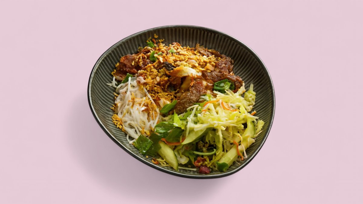 warme Reisnudelsalat mit Zitronengras, frischem Salat, asiatischen Kräutern, Limette-Chili-Soße, Röstzwiebeln, Erdnuss Topping und einer Zutat deiner Wahl