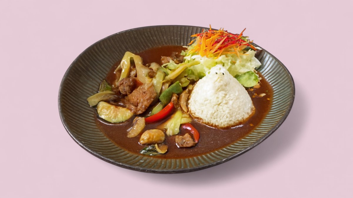 dunkle Soße mit Zitronengras, Knoblauch, Chili, frischem Gemüse, Duftreis und einer Zutat deiner Wahl