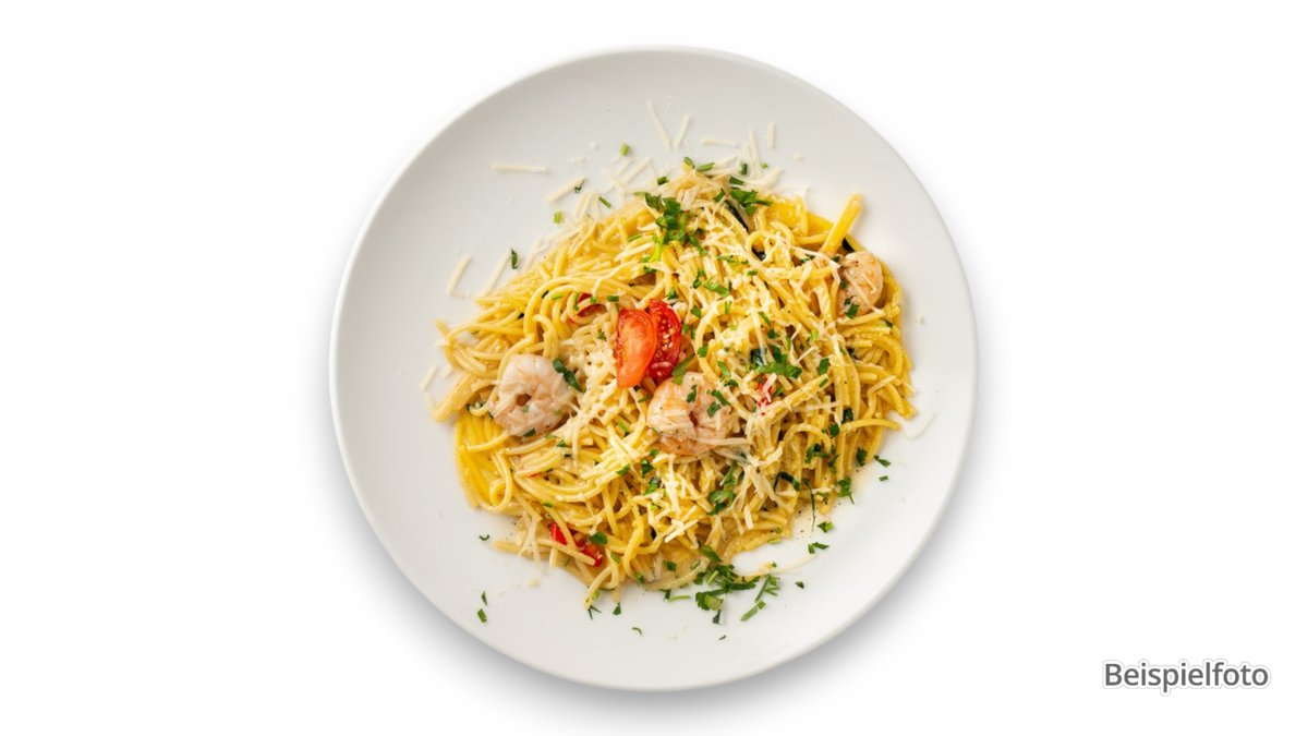 mit Black Tiger Garnelen, grünem Spargel, Sahnesauce und einer Nudelsorte nach Wahl
