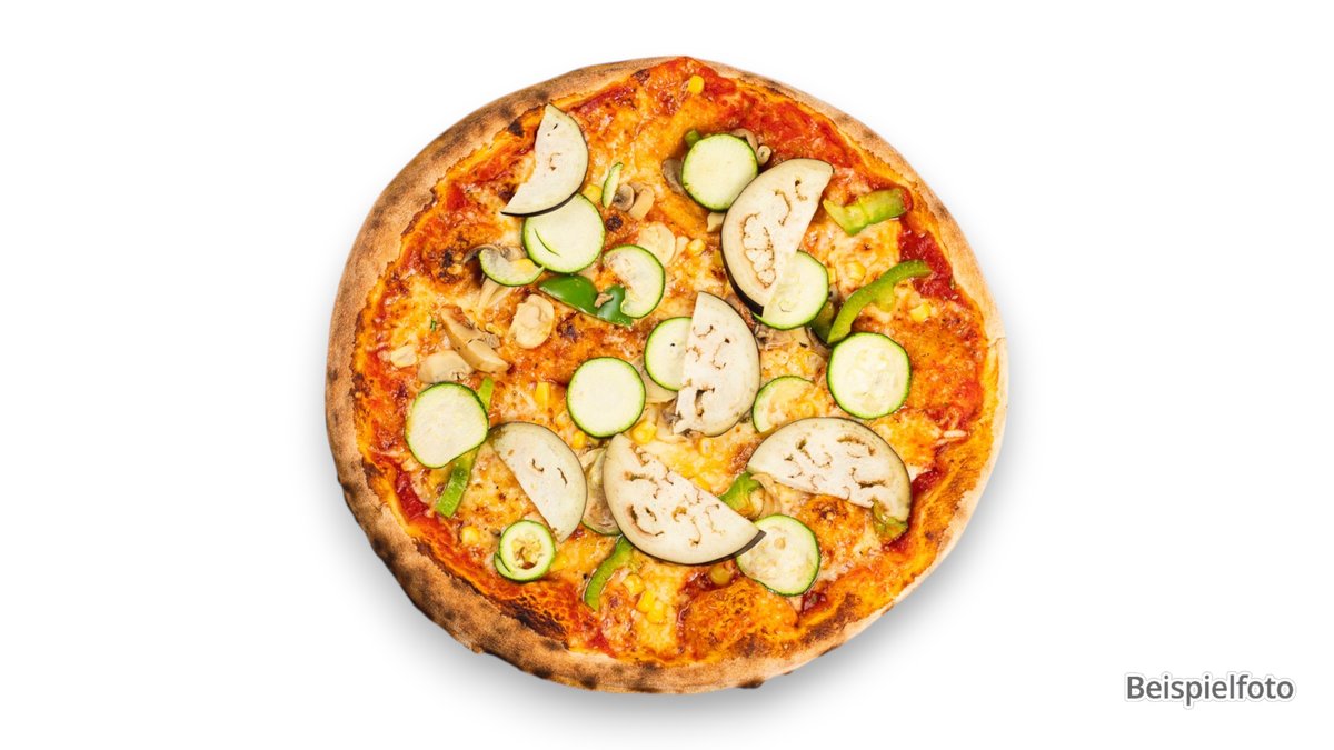 mit gelber Tomatensoße, Parmesan, Fior di Latte, Zucchini, Auberginen, marinierten Artischocken, Basilikum und EVO-Olivenöl
