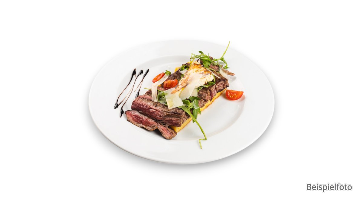 gemischte Blattsalate mit gegrillten Scheiben vom Rinderfilet, gehobelter Parmesan, Artischocken, Kirschtomaten, gegrillter Zucchini und Paprika