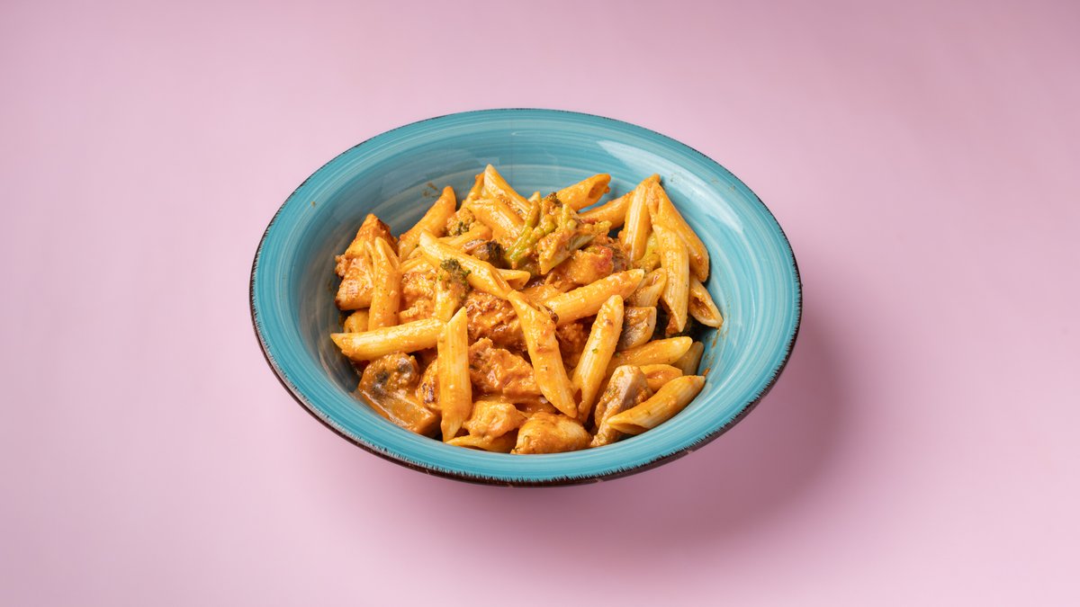 mit Hähnchenbrust, frischen Champignons, Brokkoli und Zwiebeln in Tomaten-Sahnesoße
