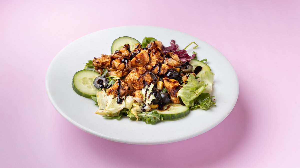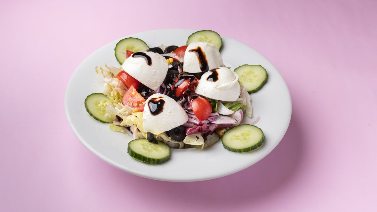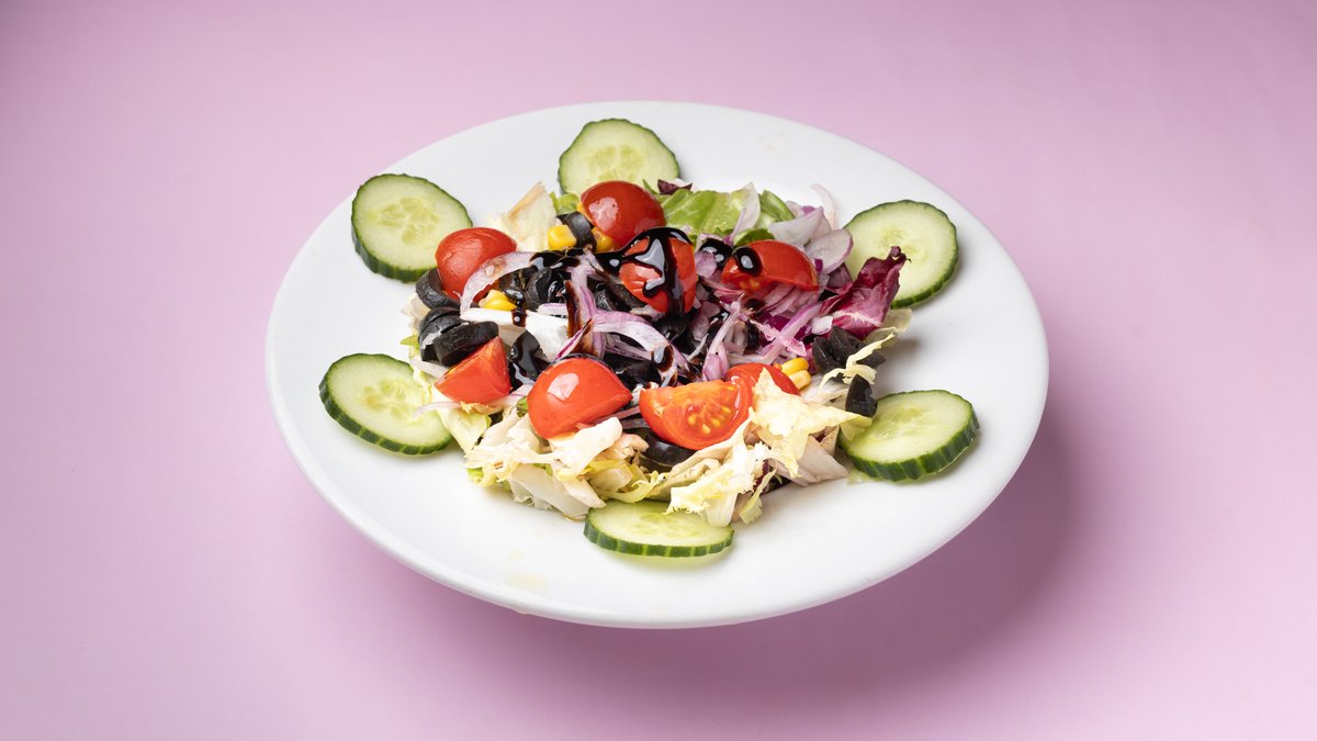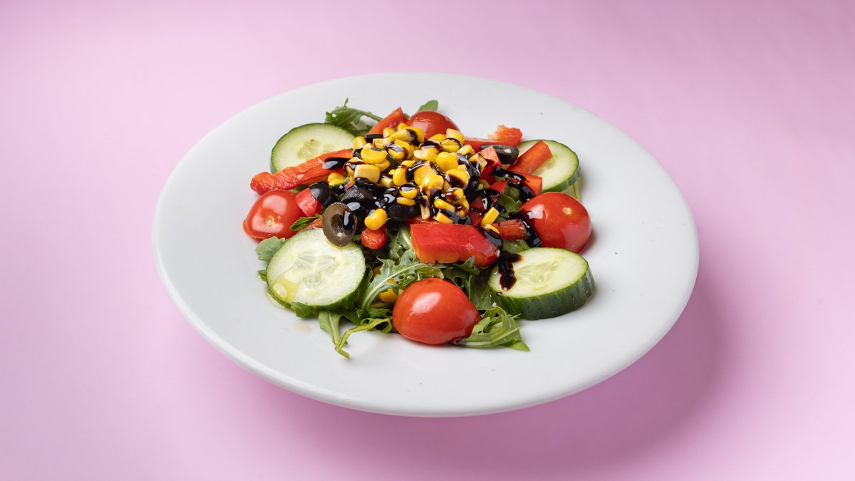 alle Salate werden mit vier verschiedenen Blattsalaten, Kirschtomaten, Gurken, Mais, Oliven und Balsamico-Creme zubereitet