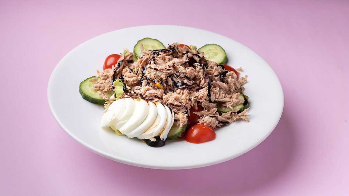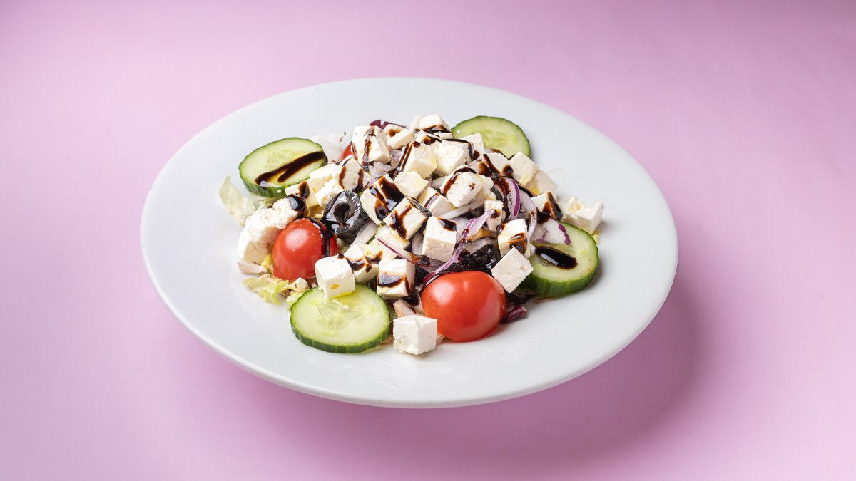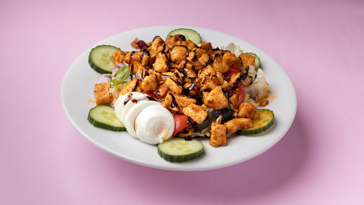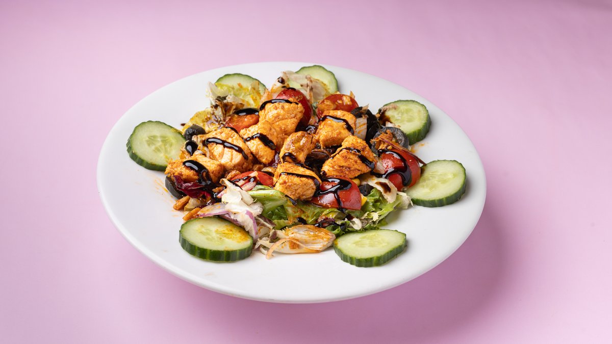 alle Salate werden mit vier verschiedenen Blattsalaten, Kirschtomaten, Gurken, Mais, Oliven und Balsamico-Creme zubereitet
