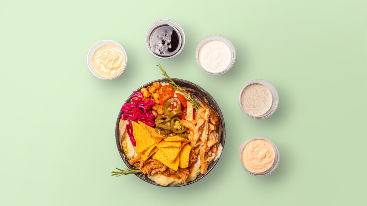 mit Reis, Guacamole, Sour Cream, Mais, Avocado, Kichererbsen, Jalapeños, vegan Rind, Rotkohl, schwarzen Bohnen, Nachos und scharfer Mayonnaise