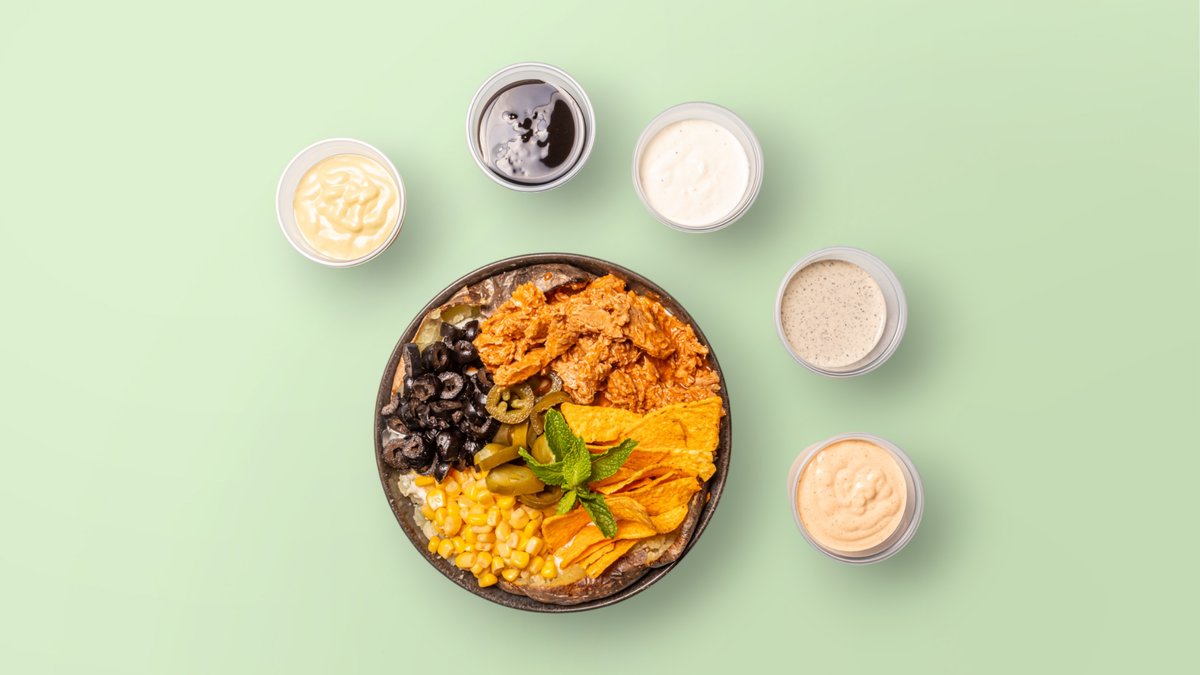 mit Rindfleisch, Hähnchen, Salat-Mix, Jalapeños, Kichererbsen, Kirschtomaten, Rotkohl, Nachos und scharfer Mayonnaise