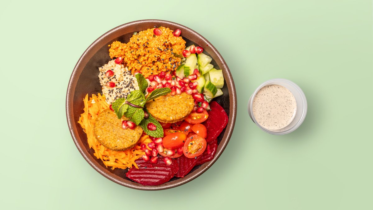 mit Falafel, Hummus, Rote Beete, Granatapfel, Gurken, Couscous, Karotten und Sesam-Dressing