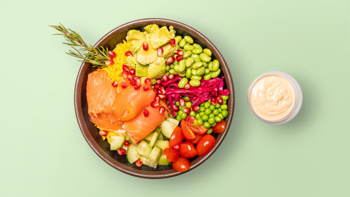 mit Lachs, Avocado, Reis, Edamame, Erbsen, Gurken, Rotkohl, scharfer Mayonnaise und Granatapfel