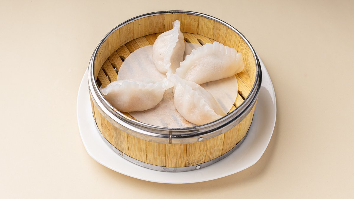 4 Stück Teigtaschen aus Reismehl gefüllt mit Garnelen, Möhren und Sellerie, gedämpft.